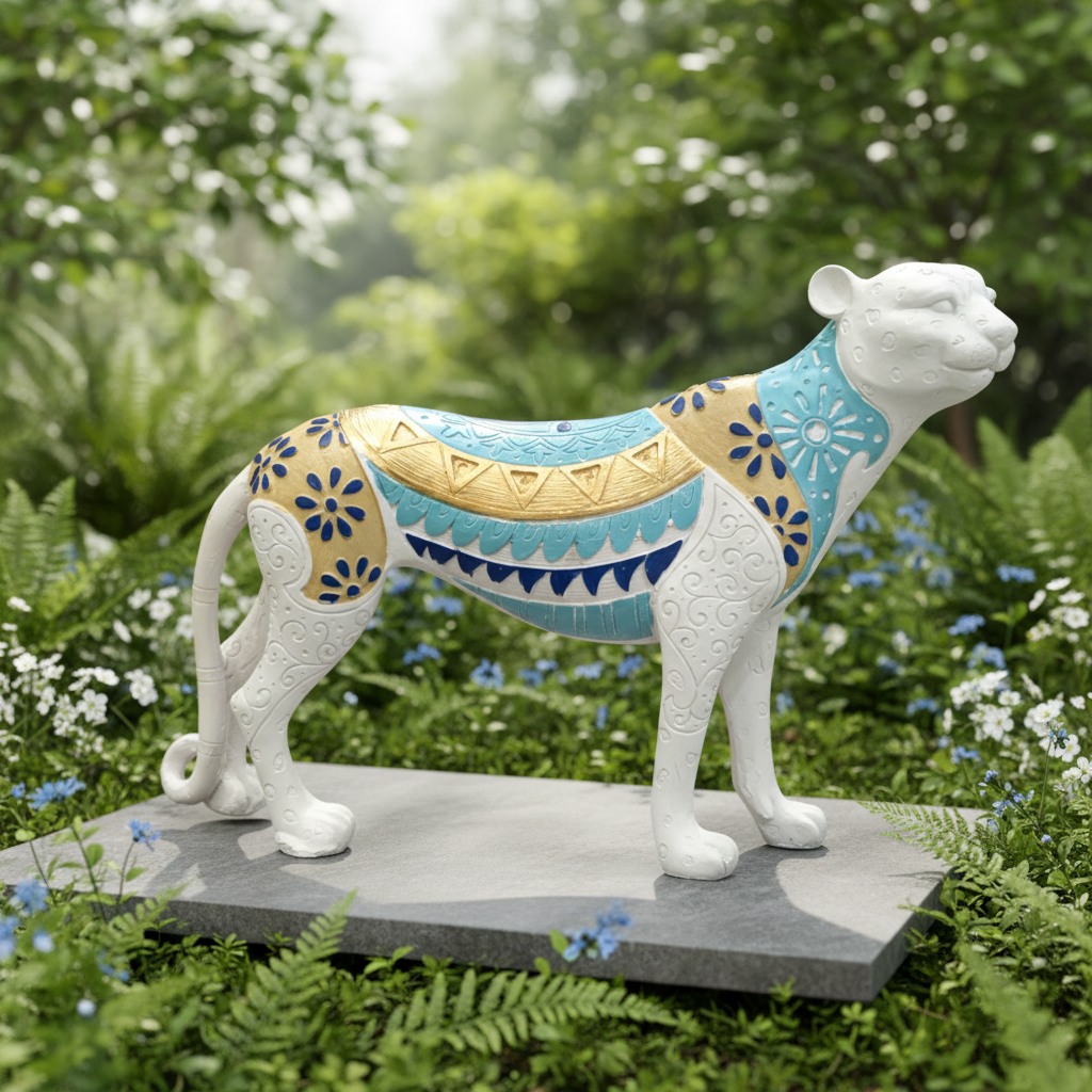 This decorative feline sculpture is crafted from durable polyresin, providing substantial weight and a smooth, foundational finish. The piece captures the animal in a noble, standing pose, displaying intricate surface detailing across the entire form. The head and limbs feature subtle, raised textures, while the main body is adorned with complex, stylized patterns. These designs combine geometric bands and delicate floral medallions, utilizing a vibrant mix of glossy applications and metallic accents. The contrast between the foundational texture and the high-sheen applied patterns creates visual depth and artistic complexity. Positioned on a console table, bookshelf, or mantelpiece, the sculpture introduces a bold, global aesthetic into the space. It serves as a striking focal point in rooms designed for maximalist or contemporary flair. An ideal addition for sophisticated interiors.