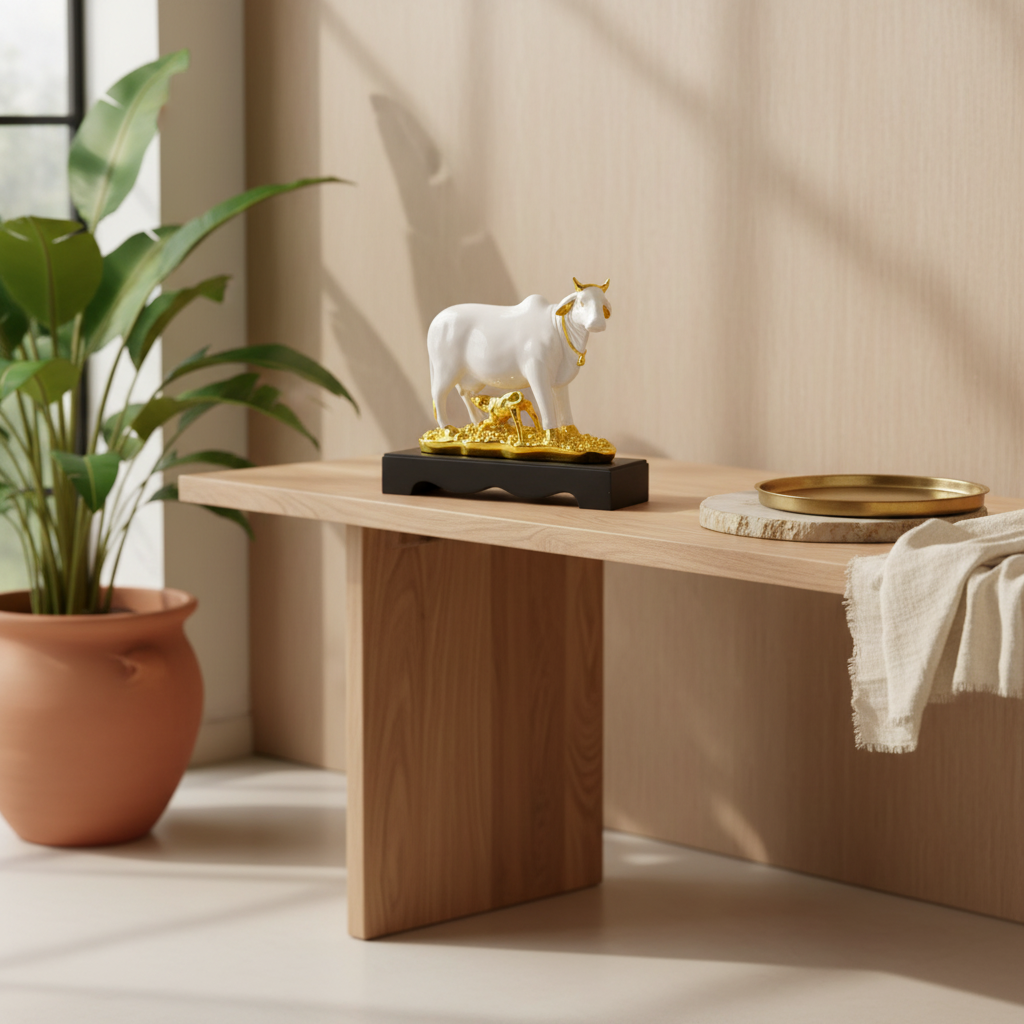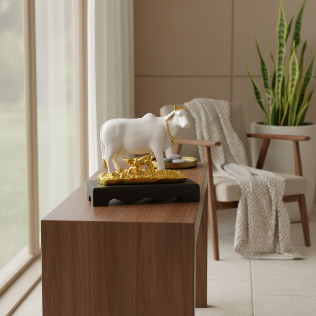 Spruce up your space and level up your shelfie game with this breathtaking polyresin sculpture! This striking piece is the ultimate home accent, designed to steal the spotlight wherever it sits. The high-gloss, superior craftsmanship beautifully captures the essence of the sacred cow and calf, symbolizing prosperity and nurturing energy. Place it proudly as an elegant table centerpiece in the entryway or as sophisticated shelf decor in your study. Looking for unique gift ideas that carry deep meaning? This figurine is a perfect choice for housewarmings and special occasions. Achieve an instant dose of luxury and positive energy. Add this magnificent showpiece to your cart and transform your interior vibe immediately!