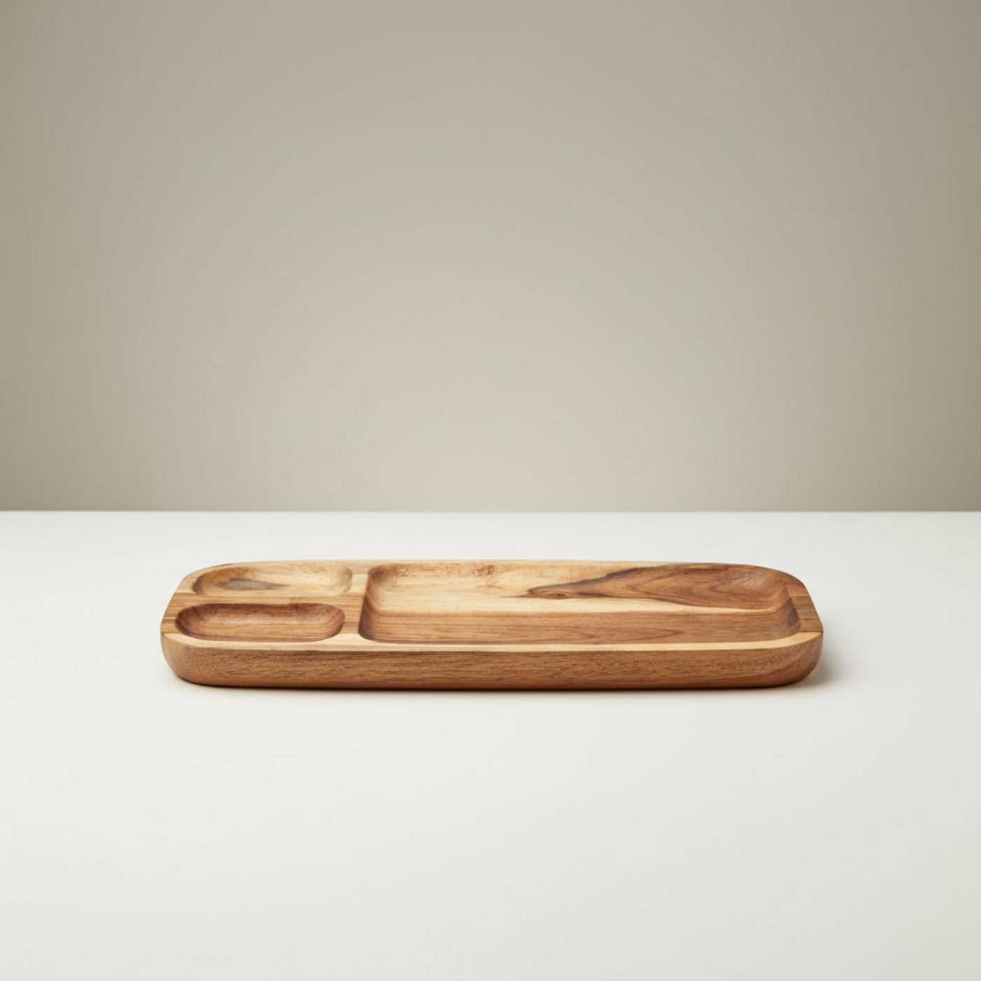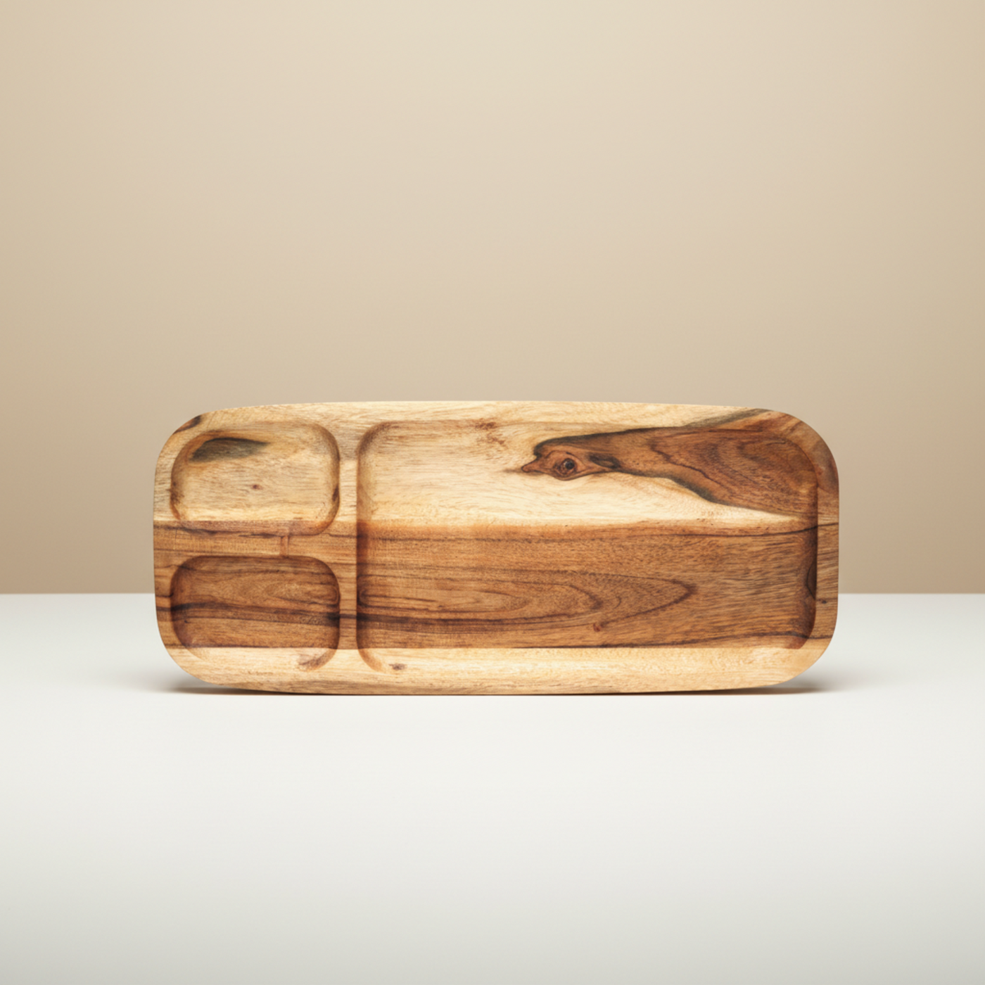 This handcrafted serving platter is constructed from solid Acacia wood, a material recognized for its durability and rich, naturally varied grain structure. The piece features a smooth, polished finish that highlights the inherent depth and patterning of the hardwood. The functional design incorporates three distinct, recessed compartments, allowing for organized presentation of appetizers, charcuterie, or small snacks.